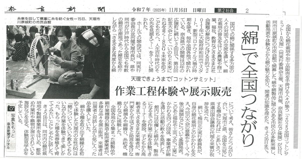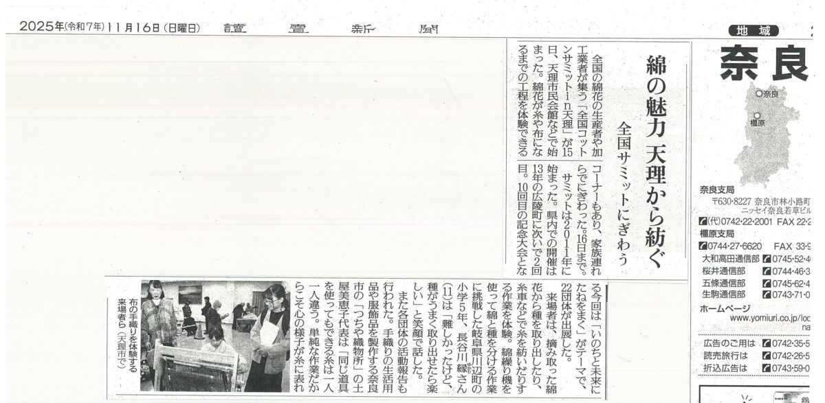 令和7年(2025)11月16日(日)付の『奈良新聞』朝刊、『読売新聞』朝刊にそれぞれ「綿で全国つながり」「天理できょうまでコットンサミット」「作業工程体験や展示販売」(以上、奈良新聞)、「綿の魅力 天理から紡ぐ。全国サミットにぎわう」(以上、読売新聞)との見出しで、2025全国ットンサミットin天理の開催を報じる記事が掲載されました。