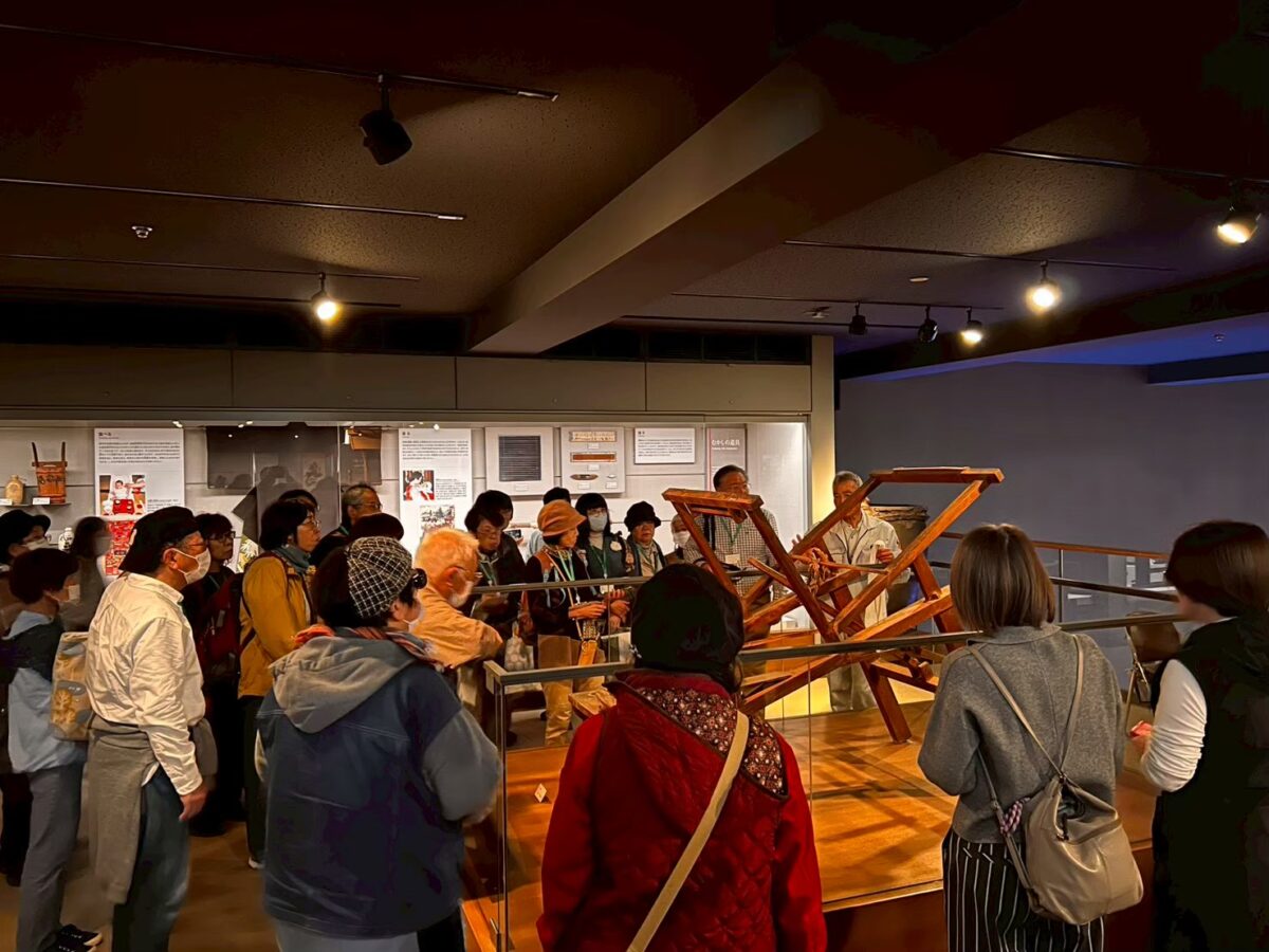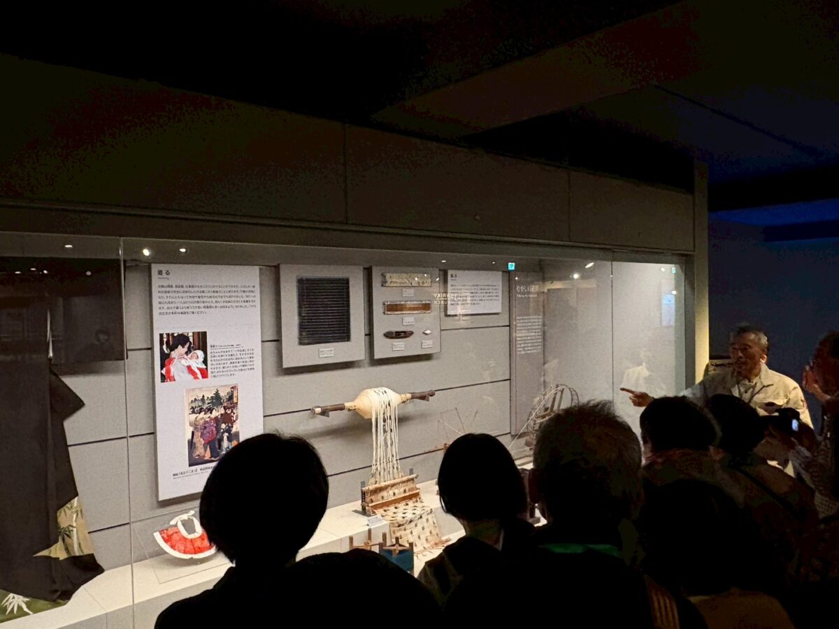*2階常設展示コーナーには、8反分の経糸を巻いた珍しいチキリや大和機が展示されています。なお、エクスカーションで「天理参考館」コースを選択された方々にのみ、特別に収蔵品の中より大和絣見本帖(縞帳)、時代物の大和絣力絣文生地、大和絣七宝文生地、手紡ぎ手織りの経縞藍染蒲団生地など、往時の庶民の衣生活を窺い知ることのできる貴重な資料を公開してくださいます。(実行委員会記)