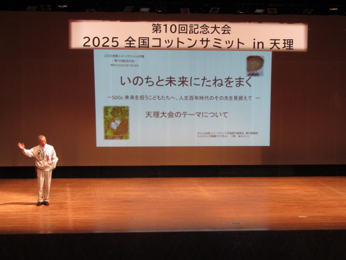 このたび天理市長様、全国コットンサミット実行委員会本部事務局様のご理解とご協力を賜り、ご支援くださいます皆様、応援してくださいます大勢のみなさまのおかげで、「いのちと未来にたねをまく」をテーマに第10回大会を天理で開催できますことは無上の喜びであります。心よりお礼申し上げます。