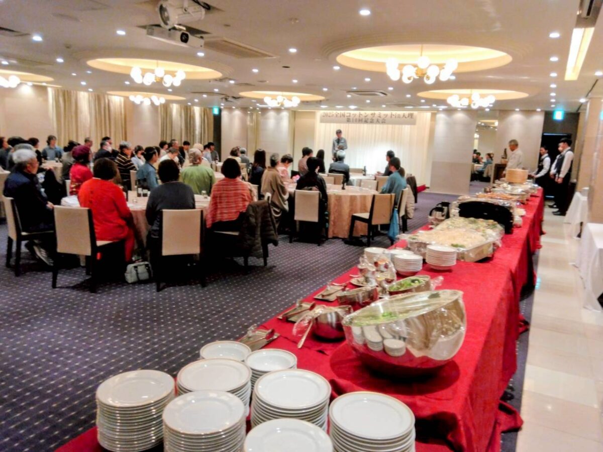 立食形式を基本に考えています。全国各地の綿の仲間に出会えるチャンスです。異業種の方とのお話の中からは思わぬ素敵なアイデアが生まれるかもしれません。サミット会場近くの天理駅前からプラザホテルへ。プラザホテルから天理駅前まで送迎いたします。
